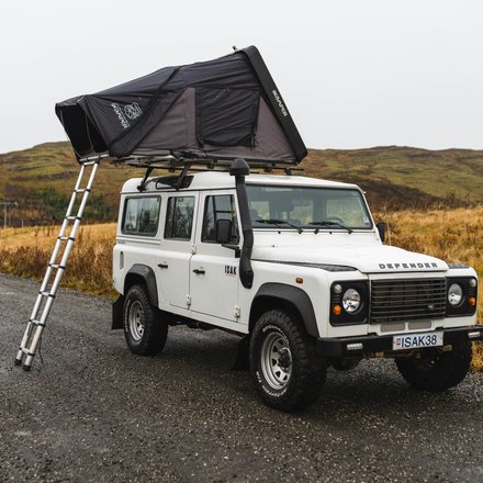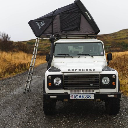 A Land Rover Defender with a rooftop tent — your mobile base for Icelandic adventure.